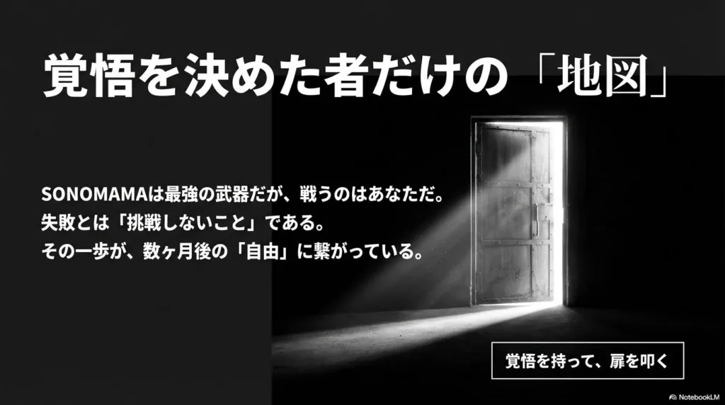 逆に、「絶対に人生を変えてやる」「そのために必要な努力は何でもする」と腹がくくれているなら、SONOMAMAは最高の武器になります。