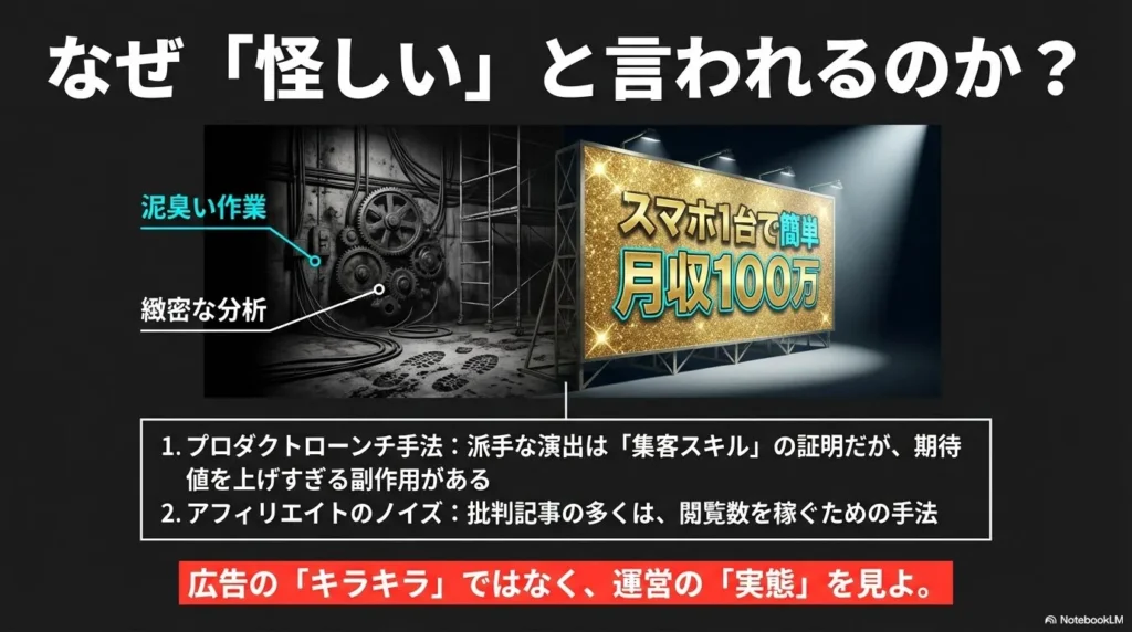 特に、「スキルなし・未経験」「スマホ一台で」といった過度に平易さを強調する言葉は、現実を知るプロの目から見れば「そんなに甘いわけがない」という反発を生みます。