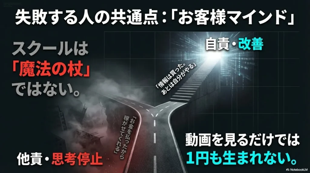 オンラインスクールが提供するのは「学習の機会と環境」であり、「稼げるという結果」ではありません。