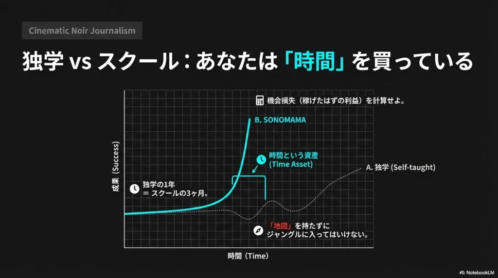 しかし、私を含めた「持たざる凡人」が最短ルートで結果を出したいなら、先人が切り拓いた道(スクール)を有料で歩ませてもらうのが、最も賢明な判断です。