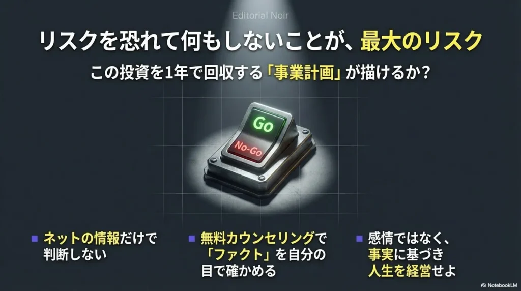 論理的なビジネスパーソンとして、ファクト(事実)に基づいて判断する姿勢を忘れないようにしましょう。投資対効果を冷徹に見極めることが、独立への最短距離です。