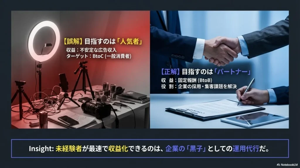しかし、実は未経験者が最も手堅く、かつ最速で収益化し、独立を実現できるのは「企業のSNS運用代行」として稼ぐBtoBのルートです。