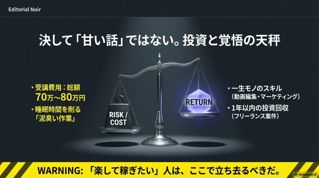 この金額を「将来への投資」と捉えて必死に回収に走れる人には価値がありますが、生活費を切り詰めて無理に契約する人にとっては、精神的なプレッシャーが成功を阻む要因になりかねません。