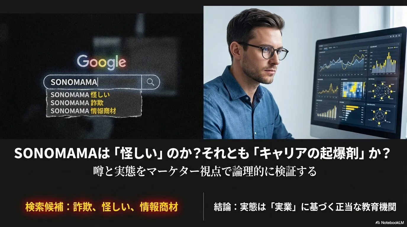しかし、ネット上には「怪しい」といった検索ワードも散見され、受講を迷っている方が多いはずです。そこで今回は、現役Webマーケターである私の視点で、SONOMAMAのカリキュラムや口コミの実態を徹底的に分析しました。