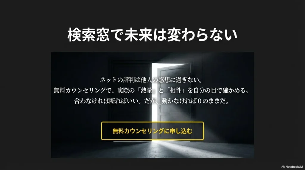 ネット上の評判をこれ以上探し続けるのは、もうやめましょう。評判はあくまで他人の感想であり、あなたの未来を保証するものではありません。もし少しでも心が動いているのなら、まずは「無料カウンセリング」で、運営の熱量と、自分自身の直感を信じて対話してみてください。