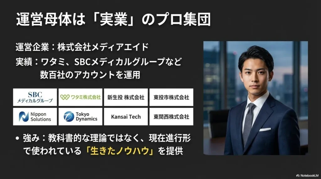 SONOMAMAの最大の特徴であり、他のスクールと一線を画すポイントは、運営母体が株式会社メディアエイドであるという点です。ここは単なる教材販売会社ではなく、ショート動画マーケティングの領域で圧倒的な実績を持つ「実業企業」です。