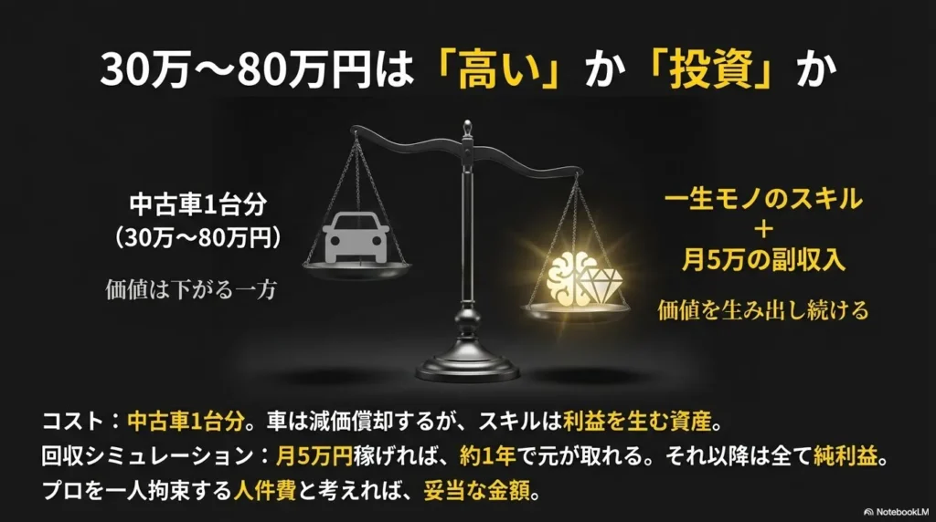 一方で、投資対効果(ROI)の視点で考えると、見え方が変わります。例えば、SNS運用スキルを身につけ、月5万円の副業収入を安定して得られるようになったとしましょう。年間で60万円です。この場合、50万円の受講料は約10ヶ月で回収でき、それ以降はすべて純利益になります。さらに、そのスキルが一生モノになり、将来的に独立して月収50万円、100万円を目指せるとしたらどうでしょうか。