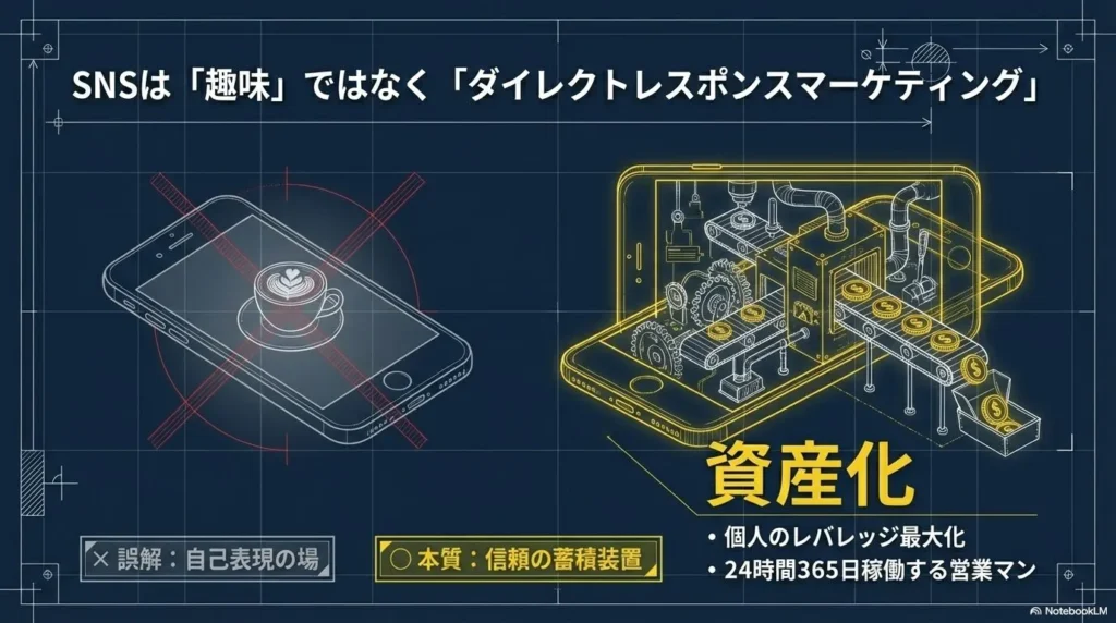 重要ポイント: SNS運用は「趣味の延長」ではなく「ダイレクトレスポンスマーケティング」の場であると認識してください。一投稿一投稿が、あなたのビジネスの看板であり、営業マンなのです。