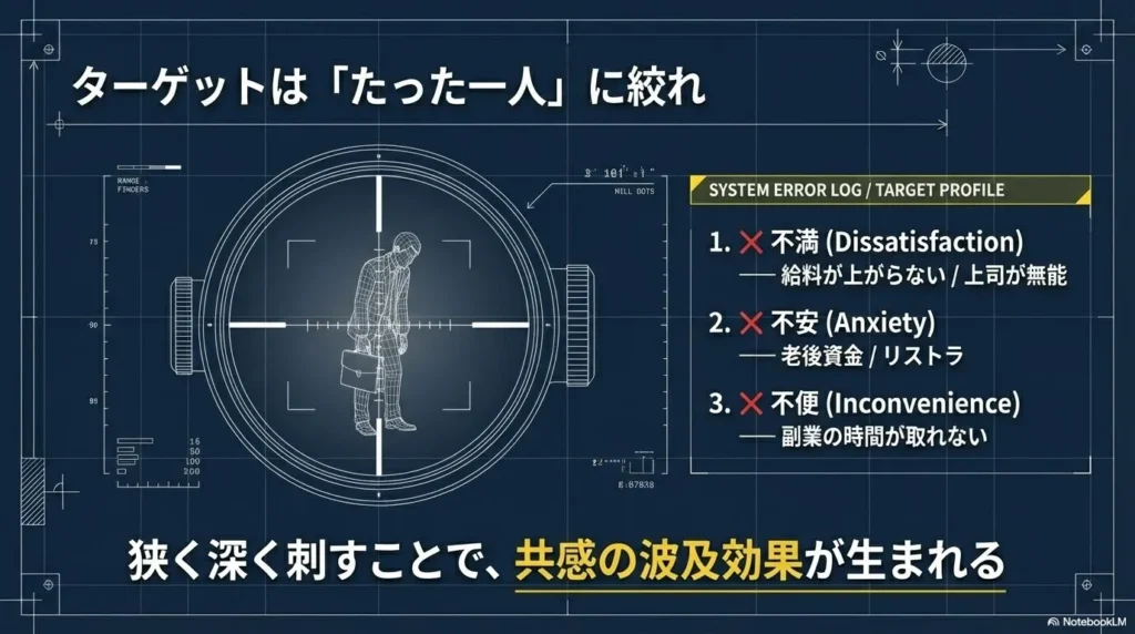 「広く浅く」ではなく「狭く深く」を徹底してください。ターゲットを絞ることは、他の人を切り捨てることのように思えて怖いかもしれません。しかし、現実は逆です。一人の人間に深く刺さる発信は、結果として似たような境遇にある数千人、数万人の共感を呼び起こします。これを「共感の波及効果」と呼びます。僕が副業初期にターゲットにしたのは、「32歳、営業職、子供が生まれたばかりだが手取りは増えず、将来の教育資金に怯えている男性」でした。ここまで絞ったからこそ、同じ悩みを持つ層から圧倒的な支持を得ることができたのです。