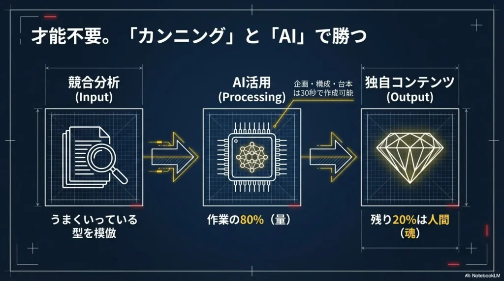 - ✅ 勝てる戦略:ターゲットの「悩み」を極限まで具体化し、AIツールで作業を効率化・量産化する。