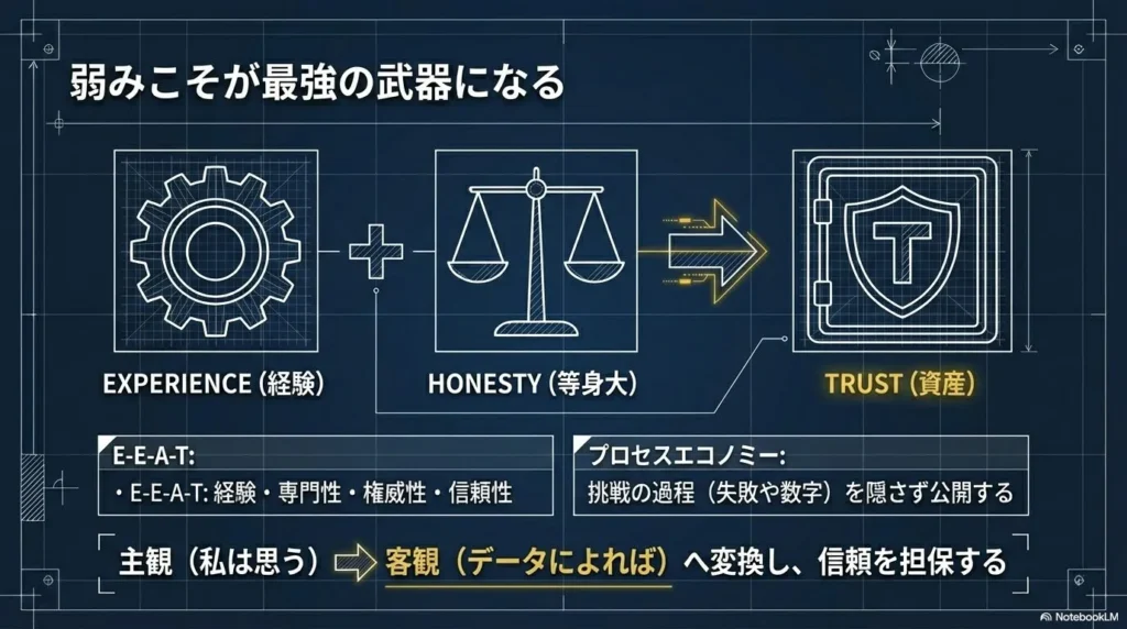 今のSNS市場において、最も重要な指標の一つが「信頼性」です。Google検索の評価基準であるE-E-A-T(経験、専門性、権威性、信頼性)の概念は、今やSNSのアルゴリズムにも強く反映されています。誰が言ったかわからない匿名の情報よりも、「実際に経験した人が語る血の通った言葉」に価値が集まる時代です。論理的に言えば、情報の「正しさ」だけならAIでも出せますが、その情報の「背景にある文脈や重み」は人間にしか出せません。