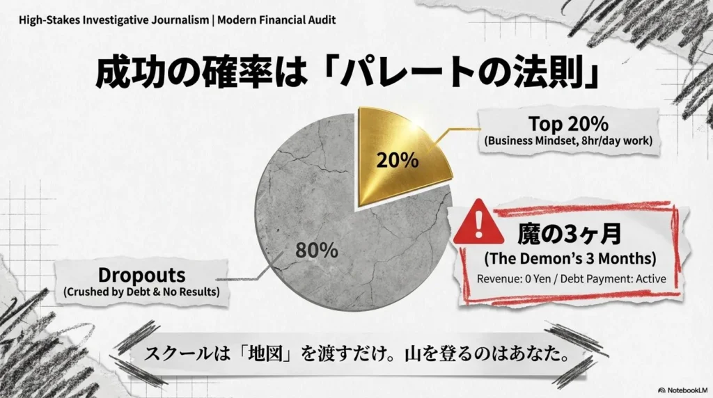 広告で語られる「成功事例」は、数千人、数万人の受講生の中から選ばれた、ほんの一握りの「超優等生」の記録です。