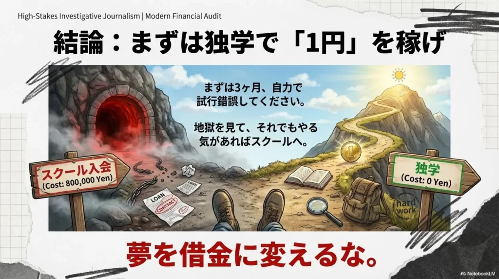 まずは自分の足元を固め、借金ではなく、自分自身の「稼ぐ力」の萌芽を確認してから、加速装置としてのスクールを検討してください。