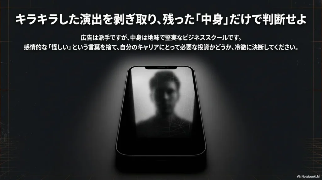 「怪しい」という噂の正体は、高額な受講料や分割払いの強調、そしてSNS特有のキラキラしたプロモーションに対する、ユーザーの拒絶反応です。