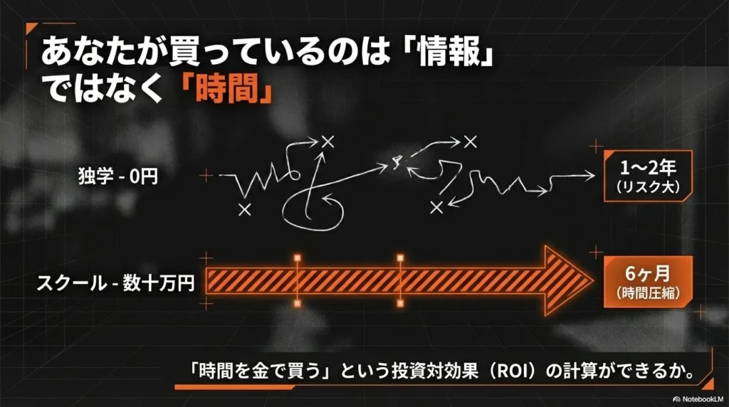 独学のメリットは「リスクの低さ」ですが、失われる「時間」という資産は、お金以上に価値があることを忘れてはいけません。