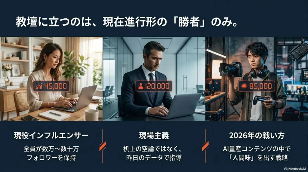 彼らが優れているのは、SNS特有のトレンドや視聴者の心理変化を「自分自身の数値」として毎日浴びているため、指導に一切の机上論がない点です。