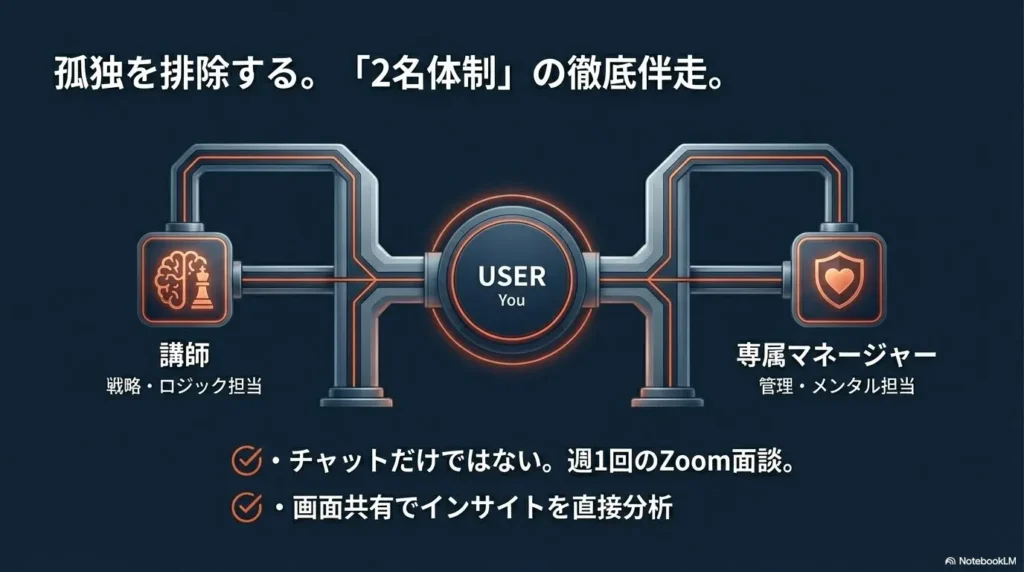 そのショートカットができること自体、講師陣が持つ最大の無形資産といえるでしょう。現役プロの脳みそを借りて運用できる環境は、未経験者にとってこれ以上ない「成功へのブースター」となります。