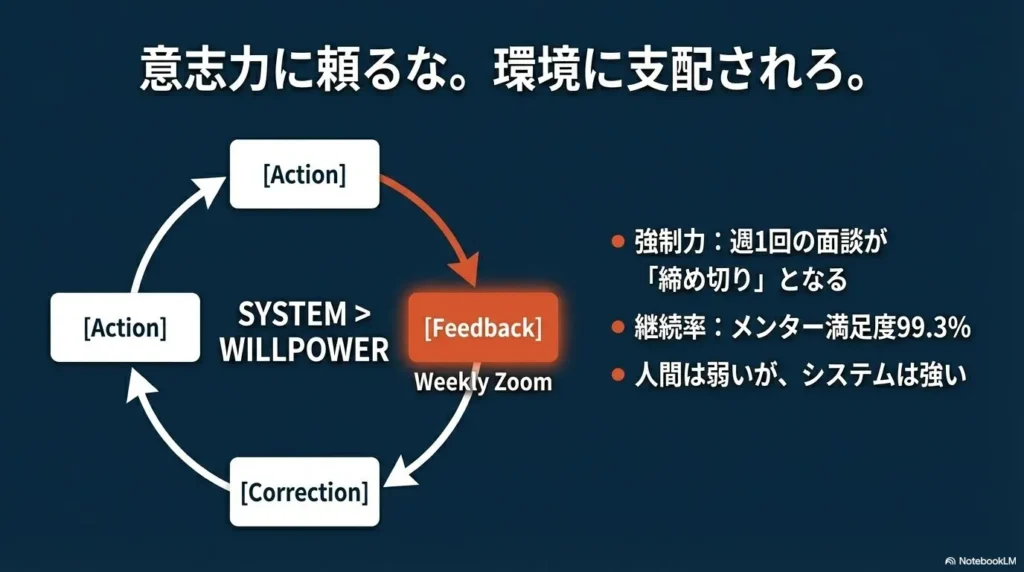 週1回の面談は、受講生にとっての「締め切り」であり、プロの講師が自分のために時間を空けて待っているという事実は、強力な自制心を生みます。